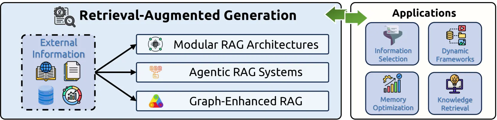 5.1 Retrieval-Augmented Generation 섹션에서는 RAG를 LLM이 가진 정적인 지식(parametric knowledge)와 외부의 동적인 정보 사이 간극을 메우는 핵심적인 시스템 구현체로 소개하며 시작합니다. 이 섹션에서는 RAG 기술이 어떻게 진화하고 있는지를 세 가지 주요 흐름으로 나누어 보여줍니다.