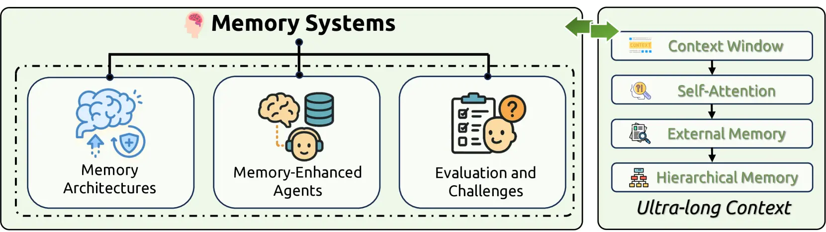Memory Architecture: LLM의 메모리가 어떻게 구성되는지에 대한 이론적 토대를 제공합니다. 메모리를 시간적 관점(단기-장기), 구현 방식(파라미터, 활성화 상태) 등 다양한 기준으로 분류하고 있습니다.